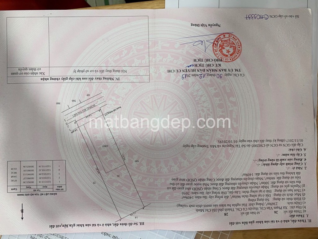 Bán nhà mặt tiền 26_28 Đường Bùi Thị Điệt, Xã Phạm Văn Cội, Huyện Củ Chi. DT: 25m x 98m, diện tích: 2369m2 giá: 11,9 tỷ Mặt tiền đường Bùi Thị Điệt, có 960m2 thổ, giá chỉ 5 triệu/m2 Đường vào đất https://www.google.com/maps/place/11%C2%B002'25.8%22N+106%C2%B032'18.0%22E/@11.040501,106.5361413,17z/data=!3m1!4b1!4m5!3m4!1s0x0:0x0!8m2!3d11.040501!4d106.53833 |