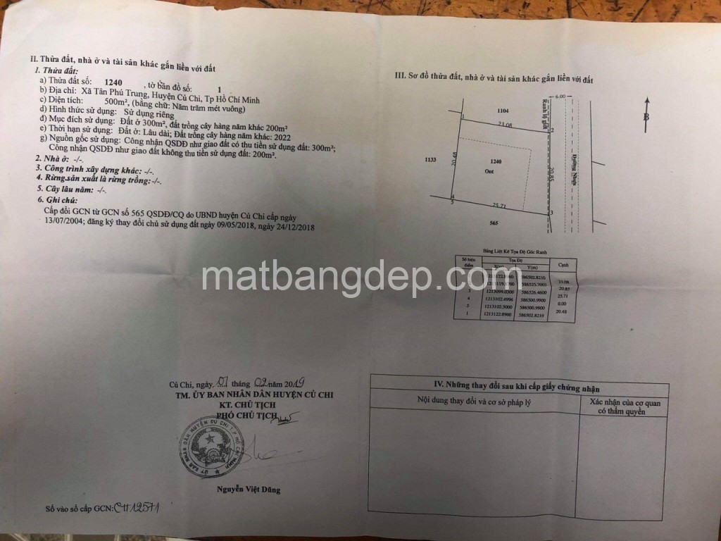 Bán nhà mặt tiền 1240_1 Đường 1, Xã Tân Phú Trung, Huyện Củ Chi. DT: 20m x 25m, diện tích: 500m2, có 300m2 thổ giá: 4,6tỷ Đường nhựa, xe hơi quay đầu.Khung đất đẹp, rất thích hợp xây xưởng, kho, làm nhà vườn Đường vào đất https://www.google.com/maps/place/10%C2%B058'07.8%22N+106%C2%B032'36.6%22E/@10.9688277,106.5434882,17z/data=!3m1!4b1!4m5!3m4!1s0x0:0x0!8m2!3d10.9688277!4d106.5434882 |