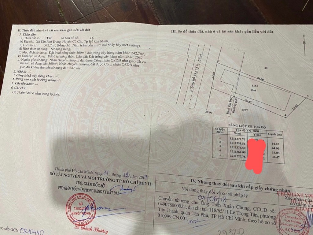 Bán đất thổ Đường Hồ Văn Tắng, Xã Tân Phú Trung, Huyện Củ Chi. DT: 14m x 45m, diện tích: 542m2 giá: 14.0 tỷ, 25.83 triệu/m2, 1000 triệu/mét ngang