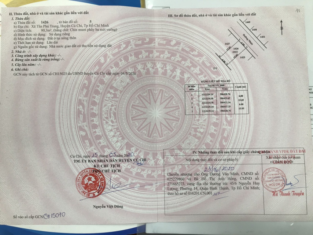 Bán đất thổ Xã Tân Phú Trung, Huyện Củ Chi. DT: 6m x 15m, diện tích: 90m2 giá: 2.350 tỷ, 26.11 triệu/m2, 391.67 triệu/mét ngang