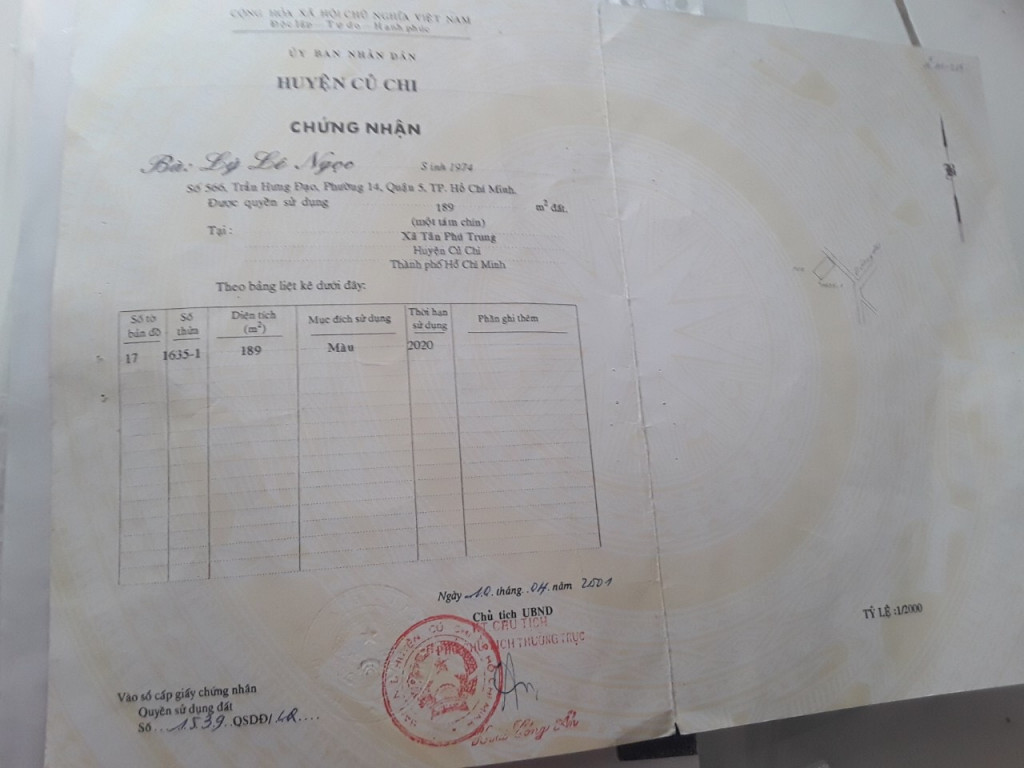 Bán đất thổ Xã Tân Phú Trung, Huyện Củ Chi. DT: 7m x 30m, diện tích: 189m2 giá: 3.7 tỷ |