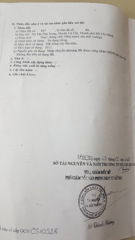 Bán đất thổ Xã Tân Phú Trung, Huyện Củ Chi. DT: 4m x 15m, diện tích: 56m2 giá: 1.150 tỷ, 20.54 triệu/m2, 287.5 triệu/mét ngang