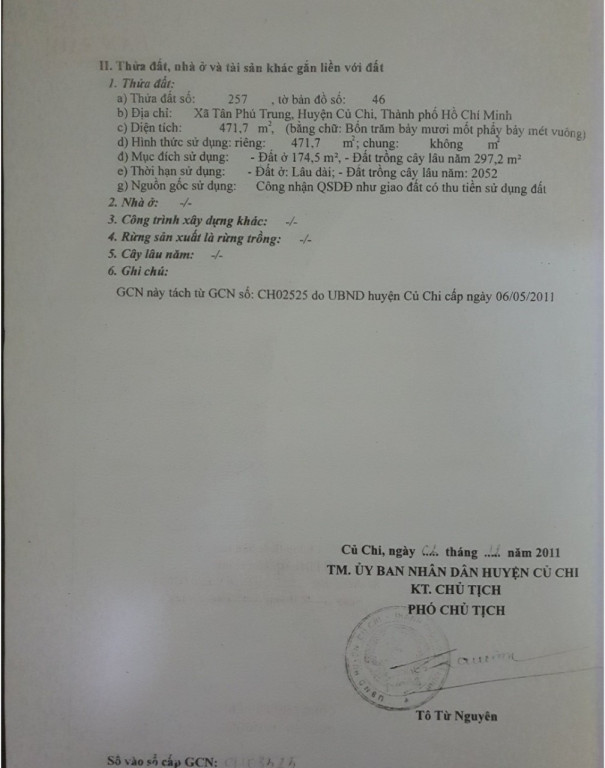 Bán đất thổ Xã Tân Phú Trung, Huyện Củ Chi. DT: 7m x 40m,NH 15m diện tích: 470m2 giá: 2.3 tỷ Bán nhà mặt tiền đường nhựa Đường vào đất https://www.google.com/maps/place/10%C2%B056'10.6%22N+106%C2%B032'07.6%22E/@10.9362778,106.5354444,17z/data=!3m1!4b1!4m5!3m4!1s0x0:0x5d7374b4ff38196d!8m2!3d10.9362656!4d106.5354378 |