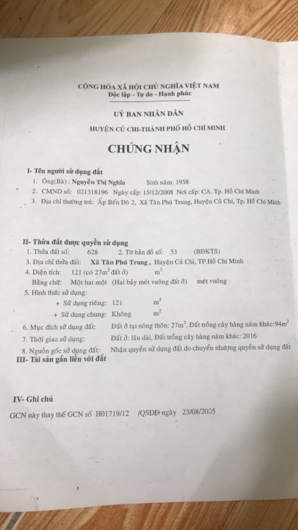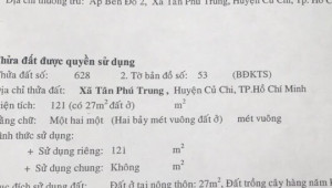 Bán đất thổ Xã Tân Phú Trung, Huyện Củ Chi. DT: 4m x 30m, diện tích: 121m2 giá: 2.8 tỷ, 23.14 triệu/m2, 700 triệu/mét ngang