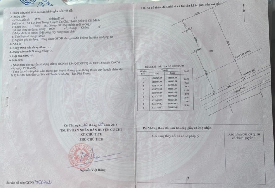 Bán đất thổ Xã Tân Phú Trung, Huyện Củ Chi. DT: 20m x 52m, diện tích: 1000m2 giá: 11.5 tỷ, 11.5 triệu/m2, 575 triệu/mét ngang