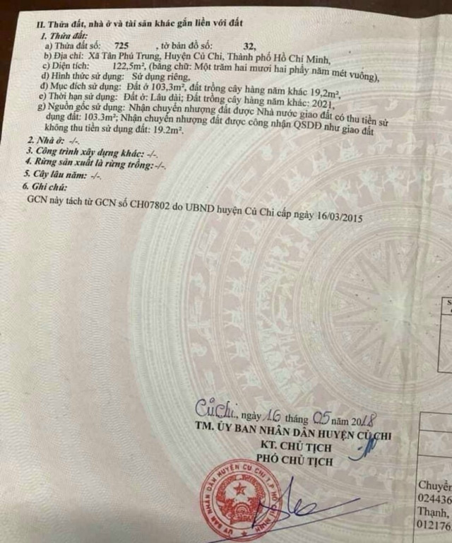 Bán đất thổ Xã Tân Phú Trung, Huyện Củ Chi. DT: 5m x 25m, diện tích: 122.5m2 giá: 2.450 tỷ MT nhựa, có xây tường rào xung quanh, có 103m2 thổ Đường vào đất https://www.google.com/maps/place/10%C2%B056'19.8%22N+106%C2%B033'33.5%22E/@10.938828,106.559293,17z/data=!3m1!4b1!4m5!3m4!1s0x0:0x93eeb17416914f5c!8m2!3d10.938828!4d106.559293 |