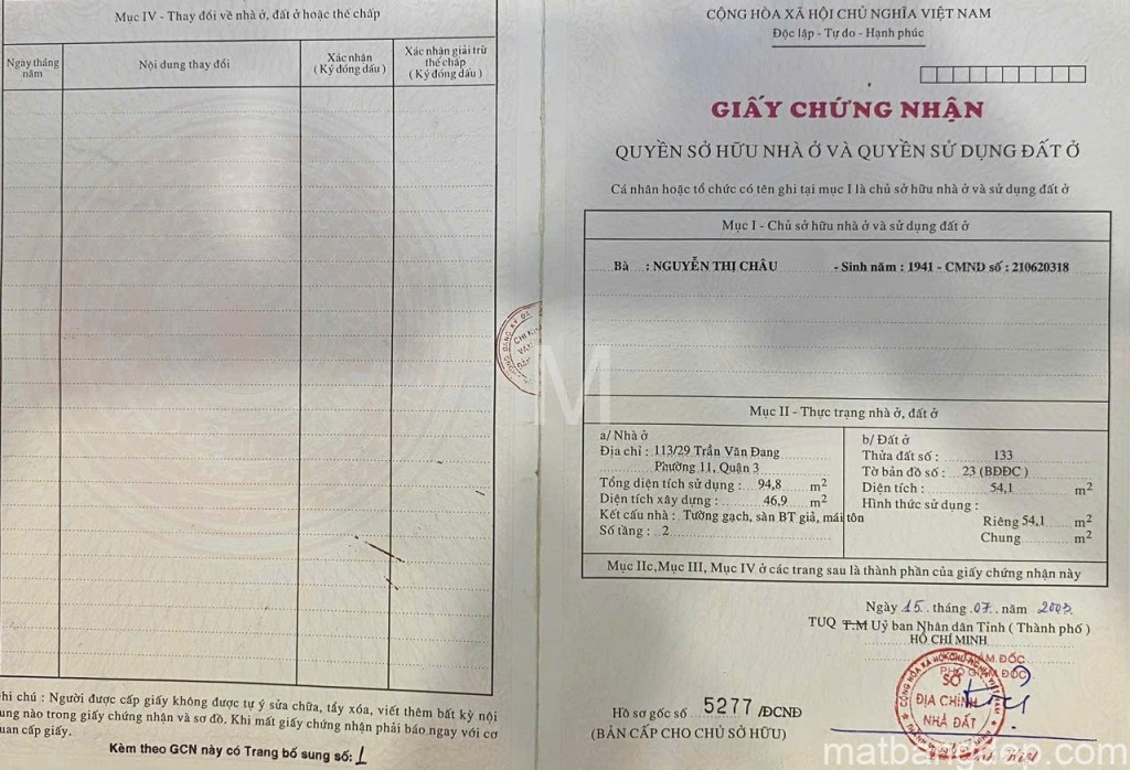 Bán nhà 113/29 Đường Trần Văn Đang Quận 3