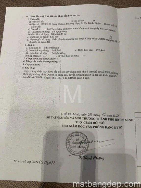 Bán nhà mặt tiền tại Số 189b/9a Cống Quỳnh Phường Nguyễn Cư Trinh Quận 1 TP. Hồ Chí Minh.