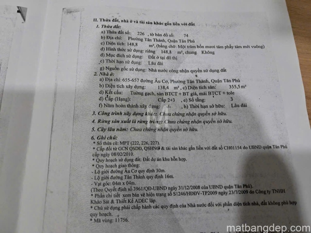 Bán nhà 655-657 Âu Cơ Phường Tân Thành Quận Tân Phú